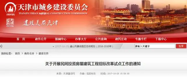 2017年10月,天津市住建委印发《关于开展民间投资房屋建筑工程招标改革试点工作的通知》: