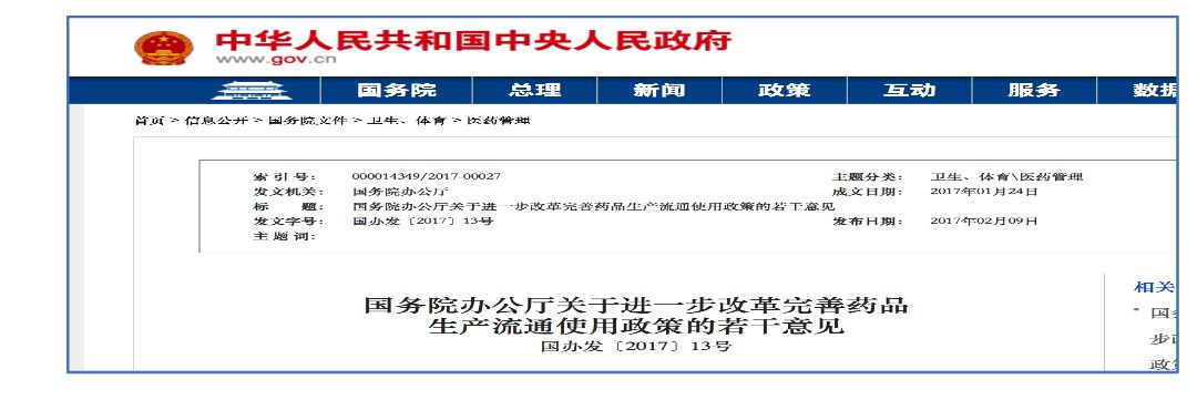 其实,针对药品集中招标采购政策的进一步改革完善,国家相关部门早就已经着手准备,在2017年2月9日,国务院发布的“国办发〔2017〕13号”文件《国务院办公厅关于进一步改革完善药品生产流通使用政策的若干意见》(如下图截图)第九条中就明确提出,完善药品采购机制。