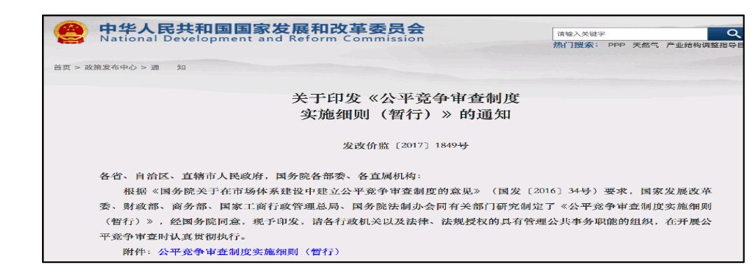 为贯彻落实国务院意见,2017年10月23日,印发了国家发展改革委、财政部、商务部、国家工商行政管理总局、国务院法制办会同有关部门研究制定的《公平竞争审查制度实施细则(暂行)》(见下图)。