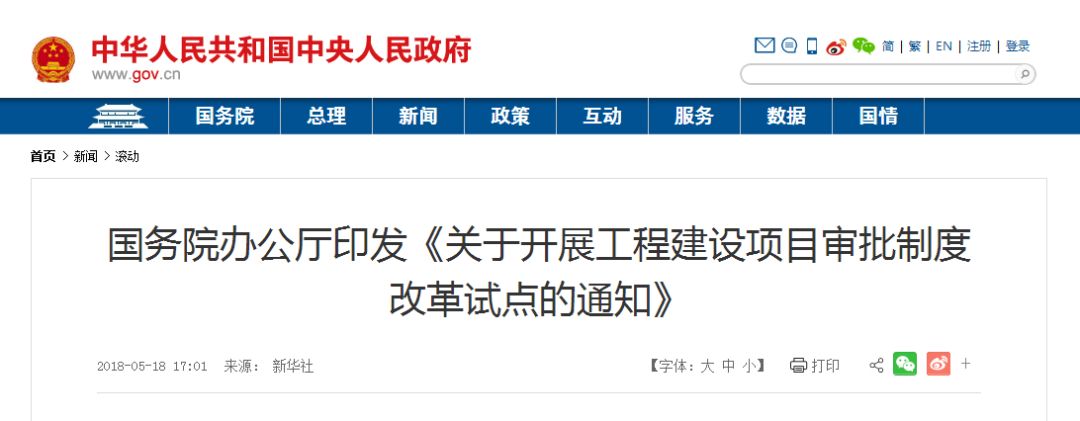 2018年5月18日,国务院办公厅正式公布《国务院办公厅关于开展工程建设项目审批制度改革试点的通知》(国办发〔2018〕33号),将大大精简审批环节,主要包括: